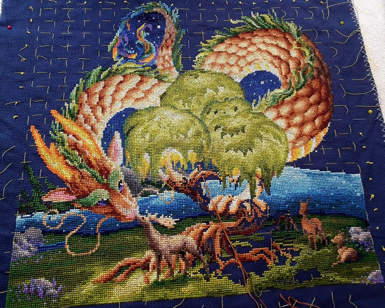 Тянула до последнего, чтоб хоть было, что показать. Кота шью только с пятницы по понедельник, но на этой неделе вообще вышивать практически не получалось. У нас сильные ветра сейчас, и малой очень беспокойный. Колики одолевают. Спит только на руках. Поэтому мои скромные было: