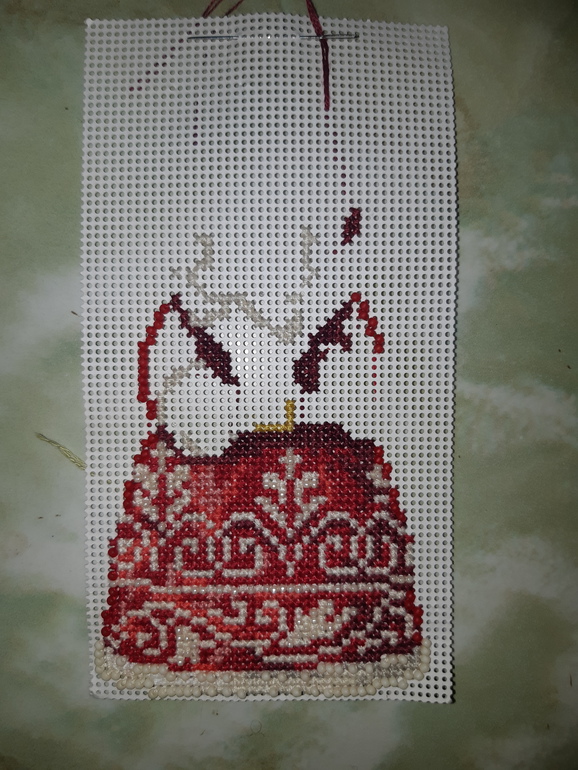 Идет медленно. Работа отнимает много времени, да еще приболели. Сопли-горло-слабость. Тут не до вышивки было.