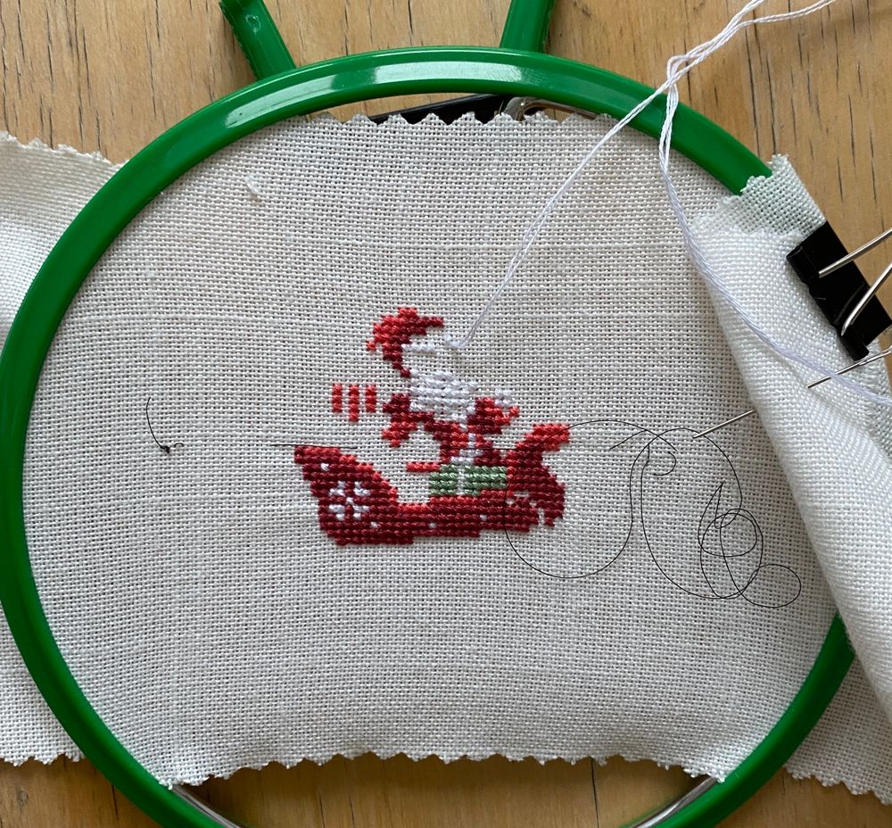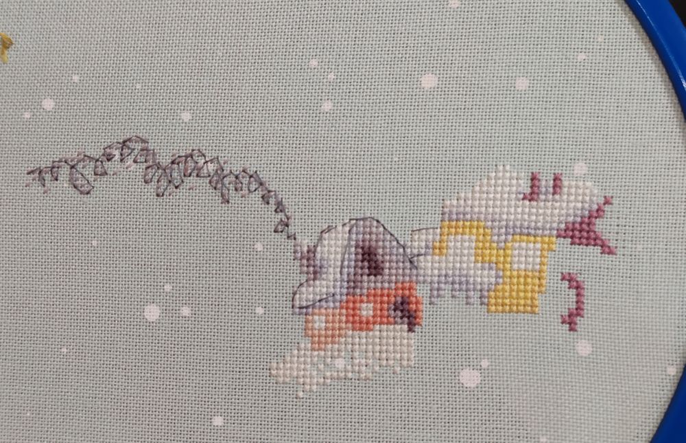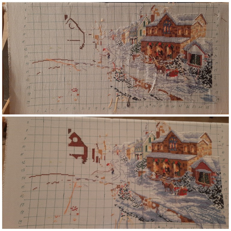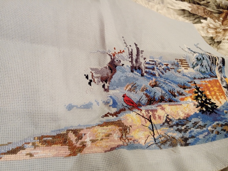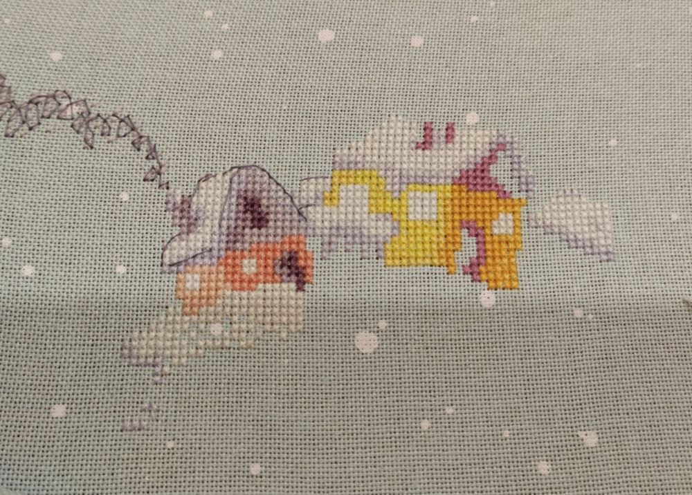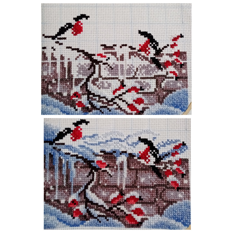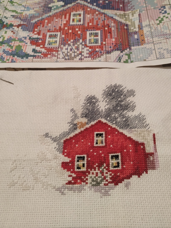 Домик я вышивала немного. Но поняла,что в итоге ошиблась в этих серых нитках. Там несколько серых оттенков полукреста. Я в итоге запуталась...пришлось распарывать