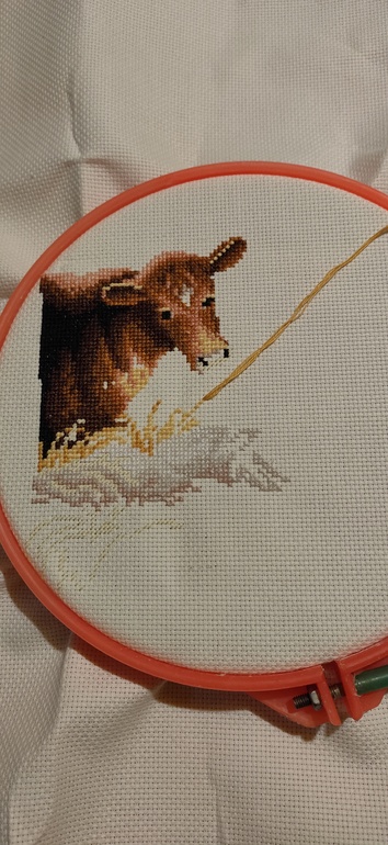 Теленок уже был вышит ранее. Поковыряла немного сено и пеленки чуток нарисовались. Так что немного совсем