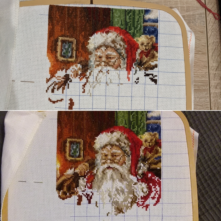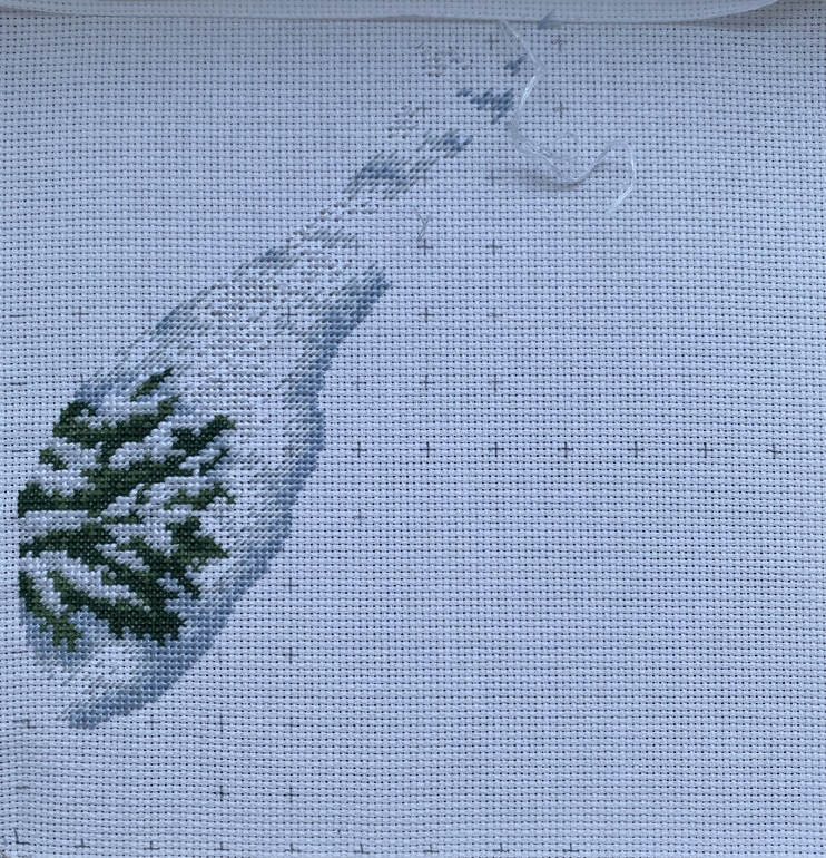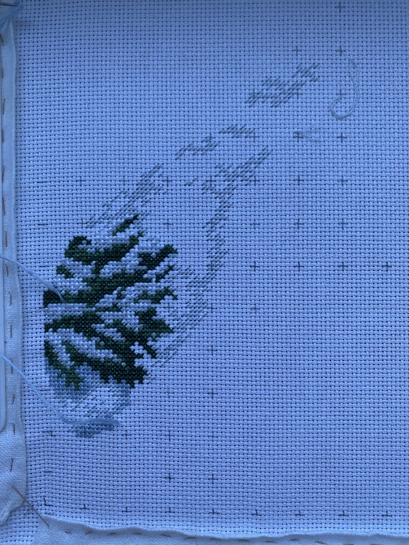 Привет! Я немного повышивала . Потом обнаружила ошибку и все распорола. Настроение ушло в ноль...За воскресенье немного поковыряла сено. Но шить без настроения в четыре нити на 18 канве, просто жесть....