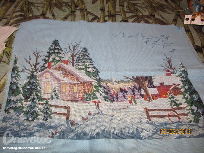 Я бы всё-таки дошила первую работу с домиком, уж больно красивая, жалко, что валяется.