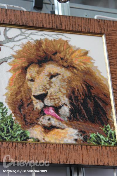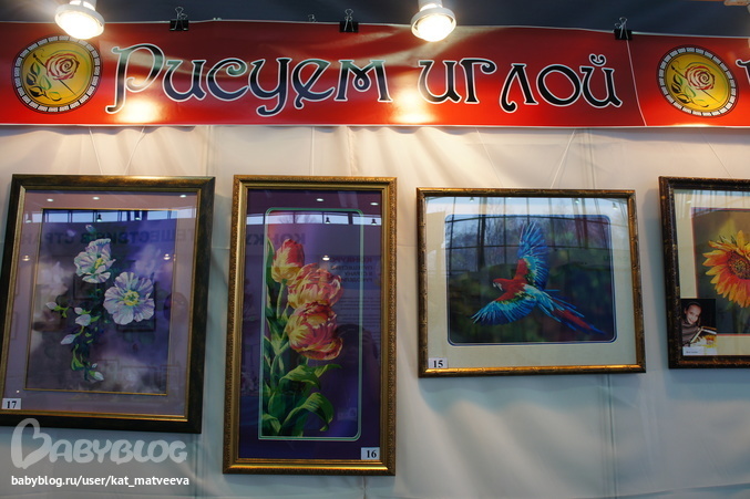 Во-первых, это выставочная стена. Она с одной стороны начиналась экспозицией ГАММЫ, потом шли "Рисуем иглой", потом еще пара небольших экспонентов с оформленными работами. Меньше всего повезло "Рисуем...". У них была вся центральная часть, и они не учли опыта предыдущих товарищей - Стич.су и Вышивай.ру - разместив все свои работы под стеклом. А напротив стеклянная стена павильона не дала сделать посетителям ни одного нормального снимка работ. Даже рассматривать было сложно, а уж фотоаппараты что винить...