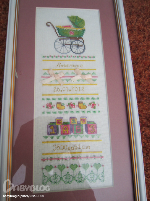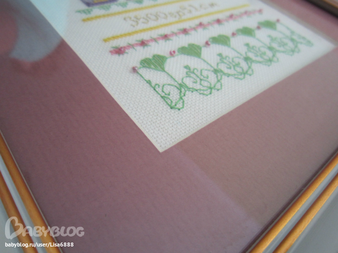 не знаю видно или нет, но натянуто не просто криво, а ужасно вкриво снизу((( просто дело в том что отдавала в багетку в тамбове я и заказывала рамку паспарту и так далее, а забирала моя сестра, потому что мы к этому времени уже уезжали, а она как говориться нибум бум в этом! я когда приехала и свими глазами увидела это чудо просто обалдела!!если бы сама забирала обязательно поругалась с ними, ну как так можно!! сантиметра полтора где то перекос снизу((( кстати говоря сестра разобрать и посмотреть а может и переделать(если эти деятели не приклеили вообще вышивку) сестра не дала, сказала что и так нравиться)))