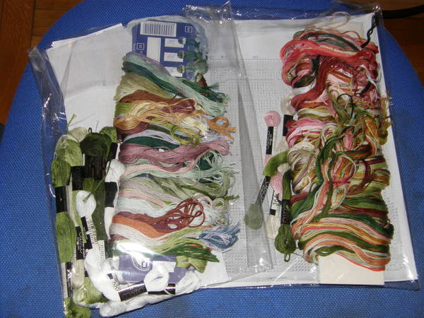 а это в пакетиках ниточки Космо( шелковистые и вообще клевые в работе и на ощупь) и схемки распечатанные, ткань Марано32 белая для процессов лежит в папочке с тканюшками. ТОже можно начать в любую секунду.