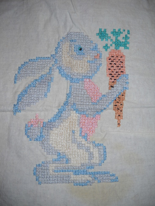 Ретро-вышивкаА я решила показать свою самую первую вышивку крестом))) Помню, увидела у подруги эту тряпочку с напечатанным рисунком зайца и не успокоилась, пока не выменяла у неё этот лоскут на какую-то кукольную одежду. Вышивала тем, что есть в наличии, поэтому морковка двух цветов получилась. Белые части вышивала на глаз, просто не хотелось дырки незашитые оставлять, хотя по задумке там просто ткань должна быть. А чёрточки на морковке сама придумала! А вообще, до этого я только гладью пробовала вышивать. Зайца вышивала лет в 11, если не ошибаюсь. Может и раньше. А т.к. мне сейчас 35.... говорю же, почти ретро!