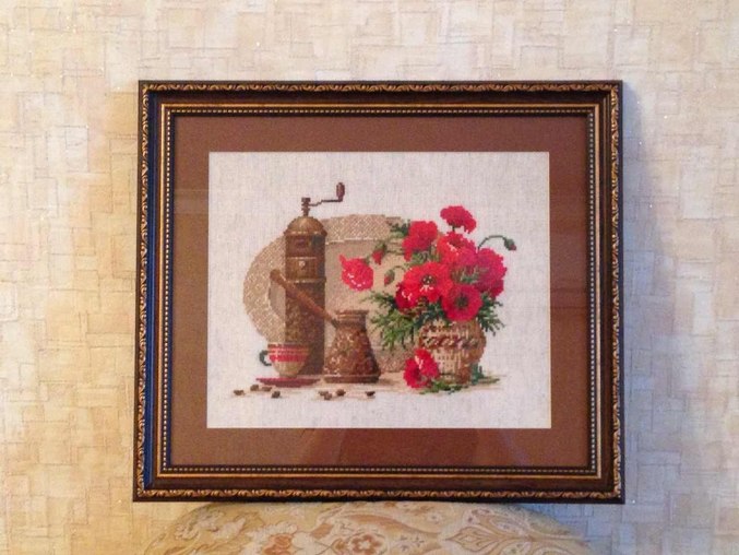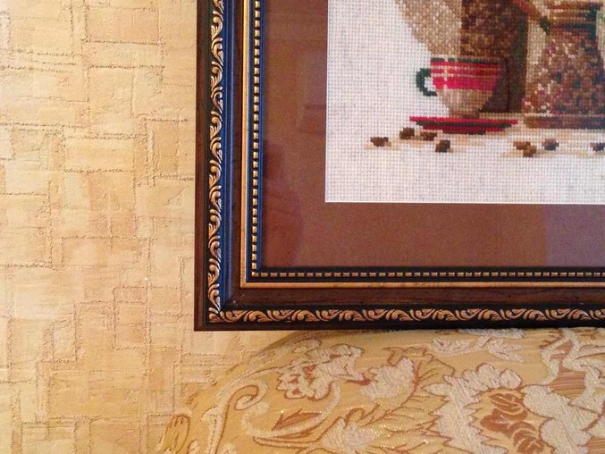 А для Кофе мне посоветовали коричневого цвета паспарту ,чтобы выделить вышивку и темно-коричневуя с золотом раму(в тон кухни моей тети)