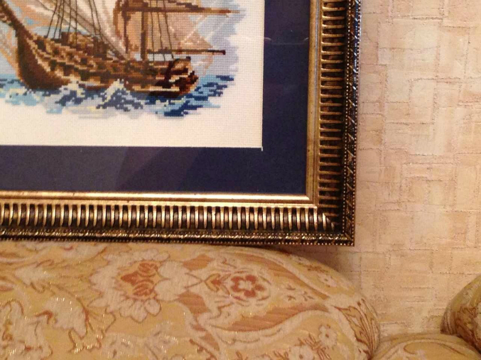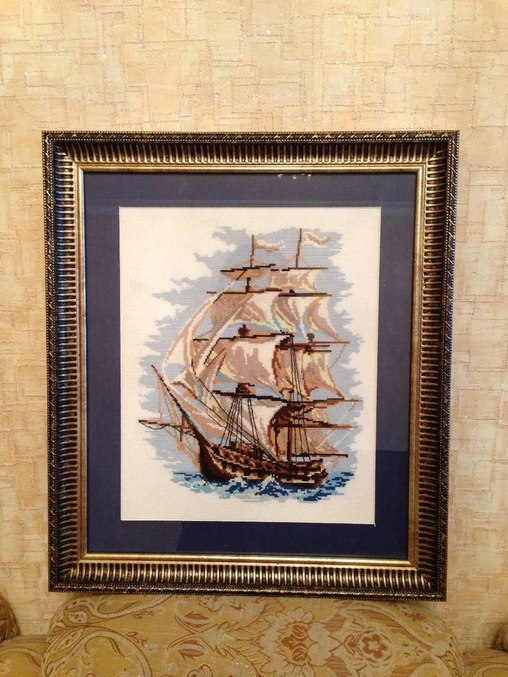 Начнем с Корабля!Долго я выбирала и решила остановиться на темно-синем паспарту и позолоченной рамке,вживую очень красиво!!!!