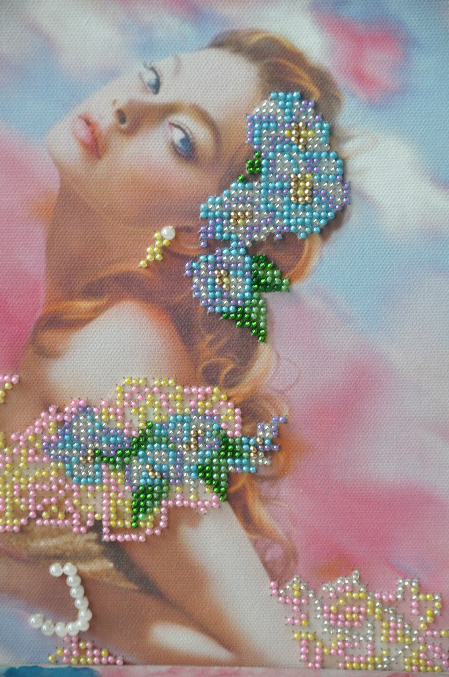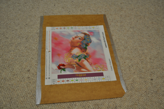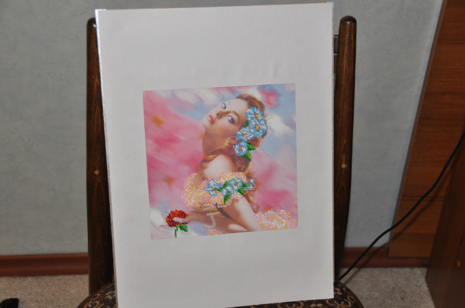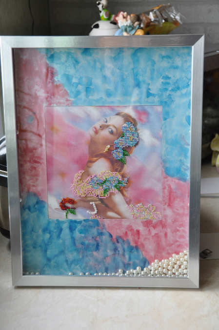 10. затем насыпала бусины в раму, сверху приложила картину с паспарту и сзади также заклеила горячим пистолетом.