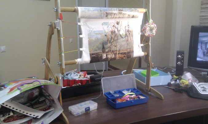 А это мой так сказать долгострой...4 месяца уже вышиваю, для меня это долго, осталось то ерунда, немного подустала от них, на бискорню отвлеклась, теперь с новыми силами доделывать!