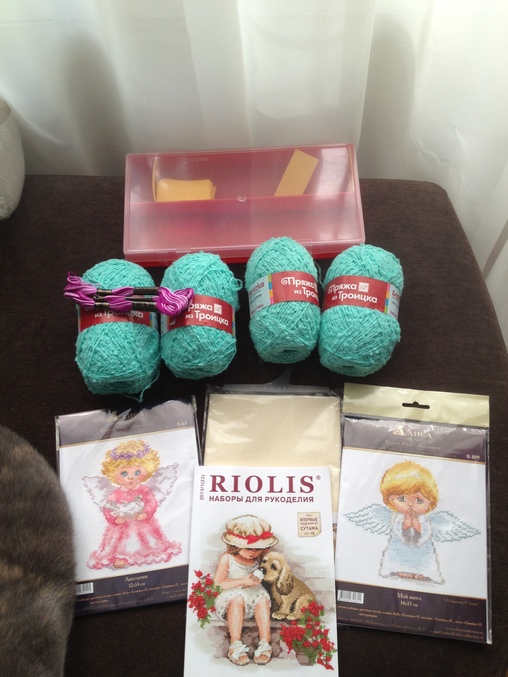 Ниточки для вязания, очень мягкие и приятные, навяжу следочков себе к следующей зиме, два наборчика для вышивания, кремовая канва, органайзер для мелочей и каталог. Восторгу нет предела!