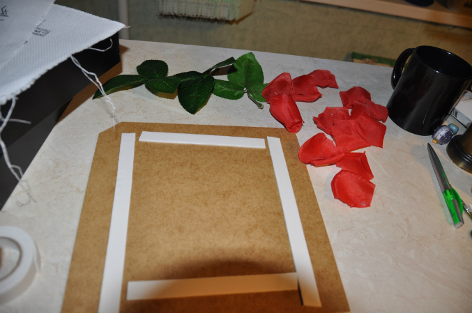 2. розы разрезаем по лепесткам, на рамку наклеиваем двухстронный скотч