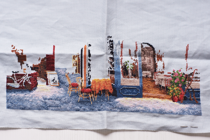 А это я вышиваю сейчас))) Всем известное Европейское бистро)))) Вообще начала заниматься вышивкой благодаря ей! Когда искала в подарок свекрове картину, то наткнулась на нее и просто влюбилась. Сначала вышила попроще, типо научиться, а теперь по-тихоньку занимаюсь ей.