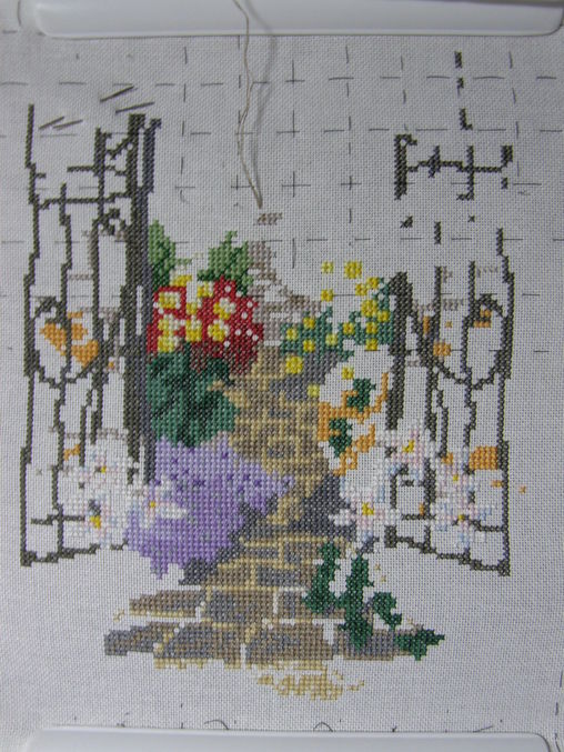 Уже ворота появились )))))) Вот те цветочки беленькие меня чуть до пены у рта не довели ))))) думаю ну как может быть и голубой и розовый в одном цветке, проверяла много раз ..... ну думаю все вышиваю , будет как будет , на то он и секретный сад )))) А потом красота получилась )))))