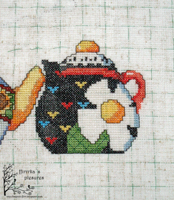 Лен, замечательный чайничек! У нас же черненькие, у меня тоже светит, они как воздушные получились) Единственное, что меня смущает - это прокрас канвы около голубенького чайничка. Там пятно льняное-льняное, которое как раз не попало под вышивку. Может, Анюта там какой-нибудь цветик вышьет, или ложечку чайную.