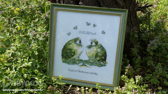 И третья работа - Лягухи - теперь наша семейная метрика!!! Спасибо большущее Тане Тане за идею и за схему!!! Вышивала по схеме, ниточки Анкор по ключу, очень понравилось работать с этими ниточками, ровно ложатся, не перекручиваются, приятные.