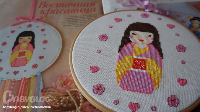 Вот я и решила проверить это на двоюродной сестрёнке Жене. 5 мая у неё День Рождения. В последнее время она увлеклась Востоком, изучает корейский язык на курсах в посольстве Кореи в Москве, а завтра она с сыночком летит путешествовать в Китай. Надеюсь, мой подарок понравится. Вторую куколку вышью позже.