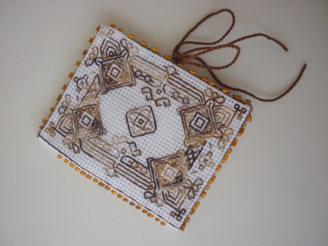 это обычная вышивка крестом. потом вышивку на толстую картонку натянула. и тыльник из ткани на другую картонку. осталось сшить вместе и украсить кружевом и бисером)))