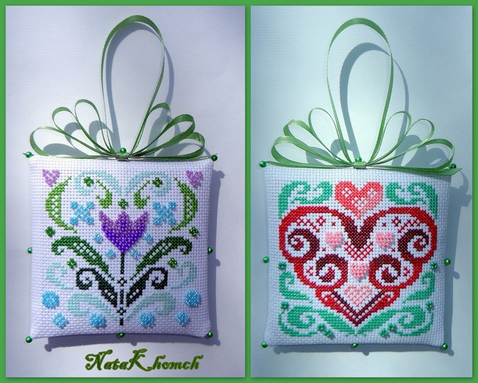 Пинкип "Весна" - 2 стороны. Канва 14 белая. Мулине, бисер, лента и плохое фото)))