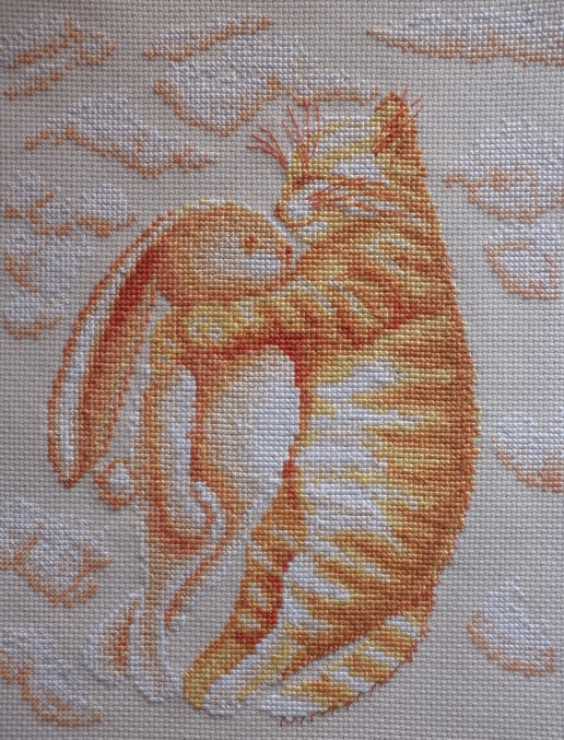 Канва Аида14,фон-облачка вышит крестом в 1 нить,киса с зайкой в 2 нити.Бэк на спине у кошки такой,что Теддики нервно курят в сторонке))))