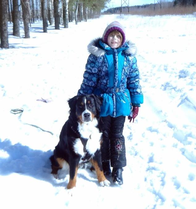 Дочка Катя и берняшка Джени. Джени сейчас 1год и 1 месяц. Она уже легко катает Катю на своей спине.)))
