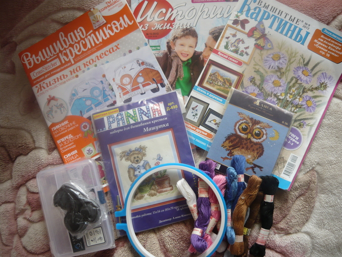 2 журнала по вышивке и журнал "истории из жизни" (почитаю на досуге), чудесные наборчики, гора мулине, пяльца, контейнер для мелочи и совершенно замечательное мыльце с запахом альпийских трав. Леночка, спасибо большое!!!!