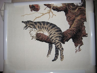 канва в апельсиновых пятнах - Уля сидела рядом и ела дольку)) не переживаю - картинка зашивается полностью, не видно будет их. Стирать пока не вижу смысла, канва станет мягкой а я вышиваю без пялец пока..