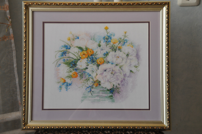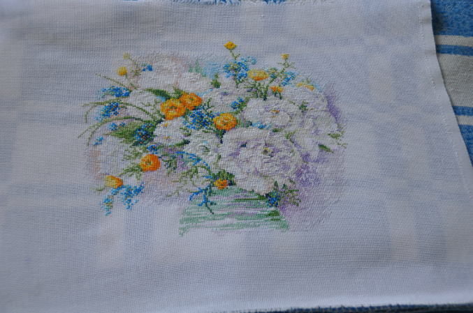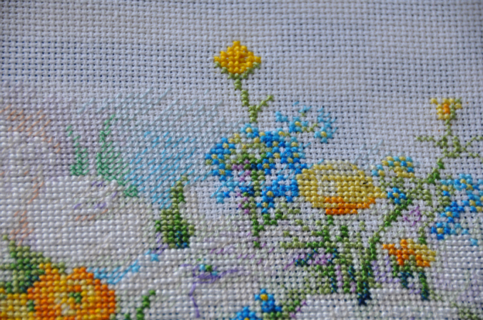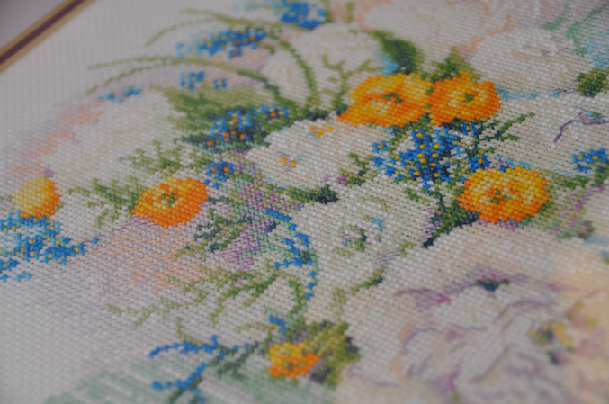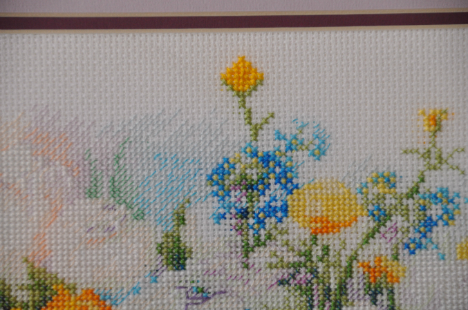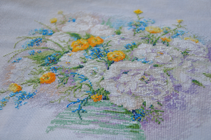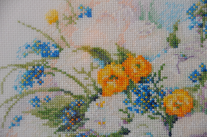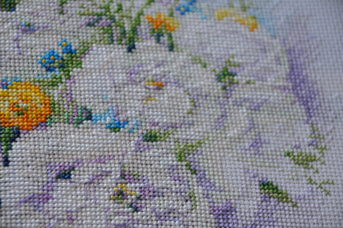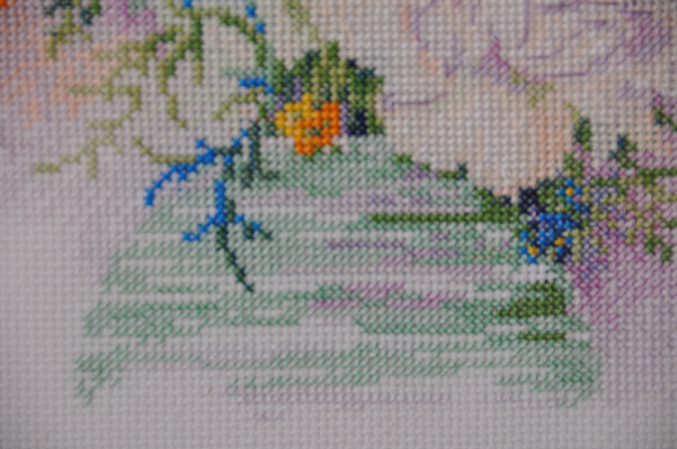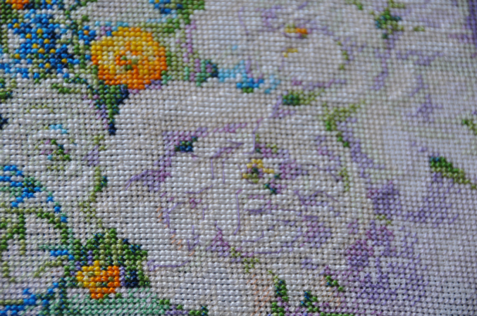 Вот когда шерстью шьешь на мягкой канве - идет хорошо, ложится нить отлично. а когда простым мулине да на канве проваливающейся - просто жуть! а еще , хоть часто не меняла пяльца - протерлась на этой мягкой канве дыра!! вот ужас был, когда пяльца сняла! пришлось шить незапланированный цветок на этом месте.