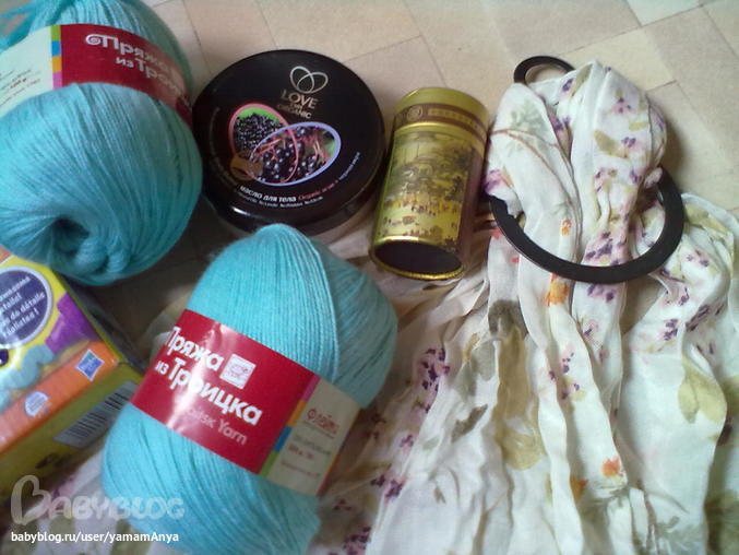 и прекраснейшие подарочки для меня! тут масло для тела, бесподобно вкусный чай, очень нежный летний палантин и!!!пряжа бирюзового цвета!!!! Обожаю этот цвет) конечно же свяжу себе шарфик на осень! Феечка, за все огромное спасибо!!!