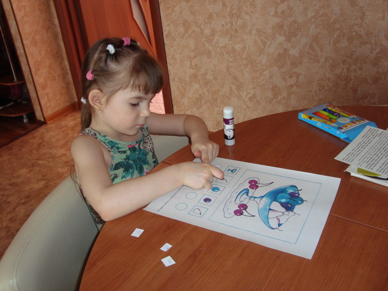 Здесь нужно посчитать фрукты в вазе и написать нужную цифру в кружок. Месяца два назад Тася плохо еще писала цифры, поэтому я написала их сама, а ей нужно было лишь приклеить.