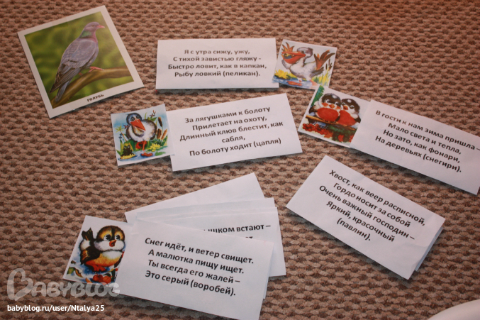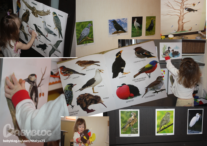 Каждай день мы рассматривали карточки, также карточки были развешаны по всей квартире. Конечно слушали голоса птиц - накачала много(могу поделиться). Так было здорово слушать, в окно било солнышко и пение птиц, просто чудесно! Включала и говорю- Настя слушай как кукушка поет- и мы вместе затихали и слушали.