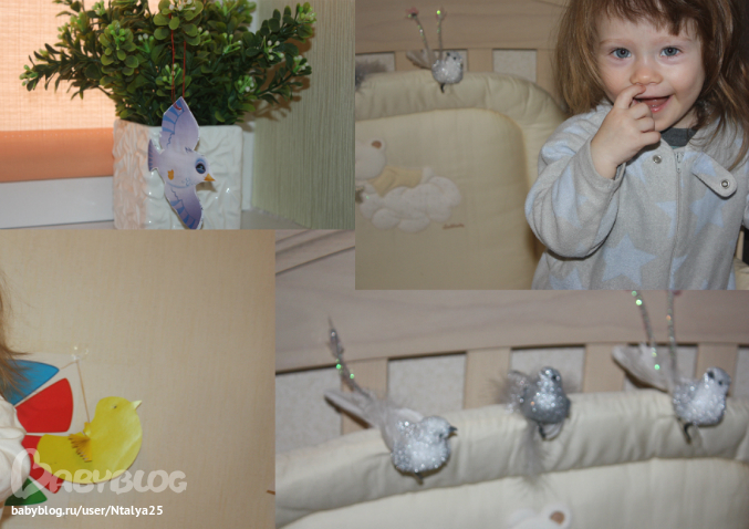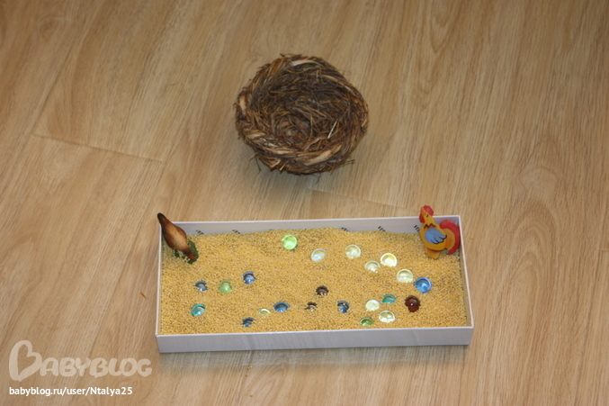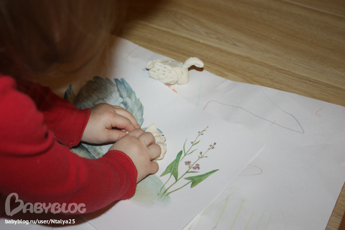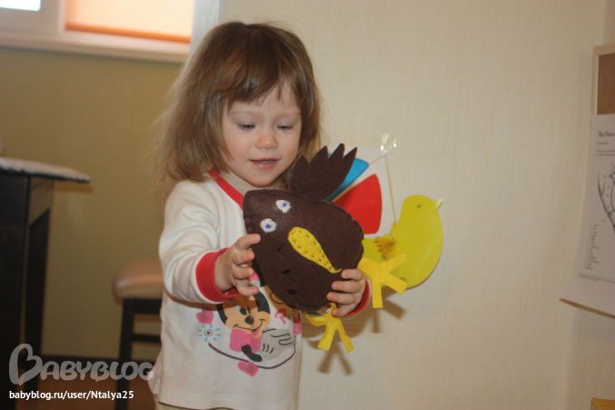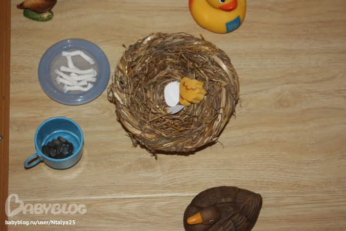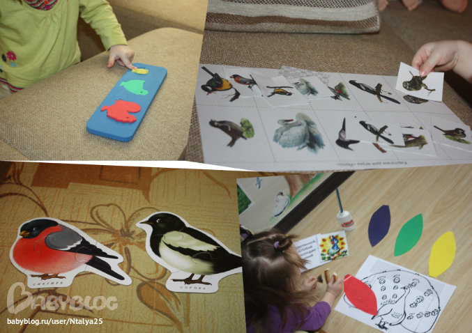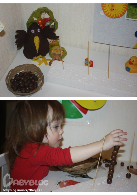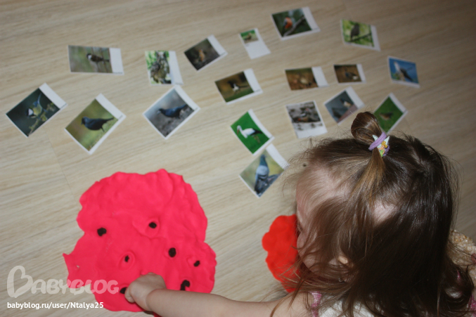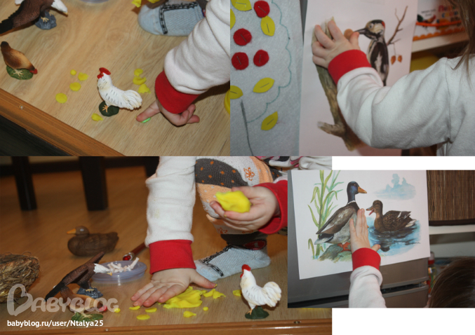 Тут тоже кормим, изюм втыкали в пластелин. Называла ей, какую птицу кормим.