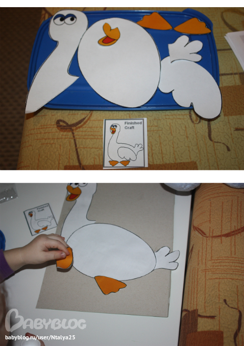 Клеим гуся. Обращаем внимание где лапки, где клюв и т.д