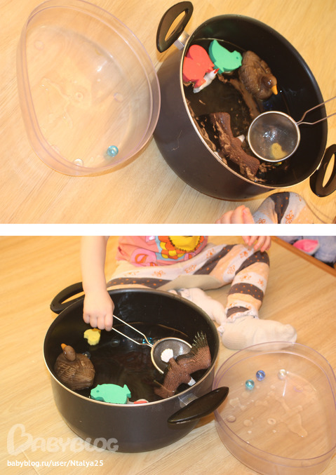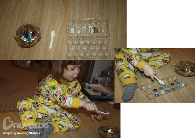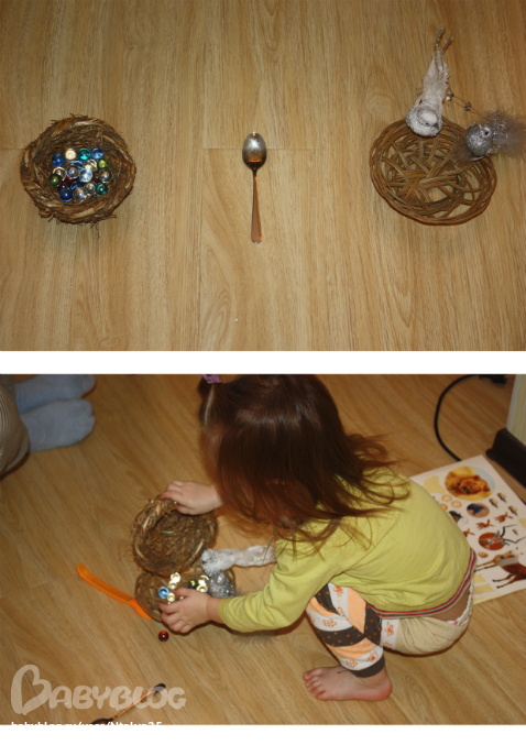 А тут нужно было помочь птичкам и перенести все яйца из чужого гнезда к ним. По одному с помощью ложки. Насте это показалось очень долгим и она решила все сразу пересыпать. Нет у нее столько времени, чтоб по одному носить)) На что папа воскликнул- Браво, моя гениальная девочка!!