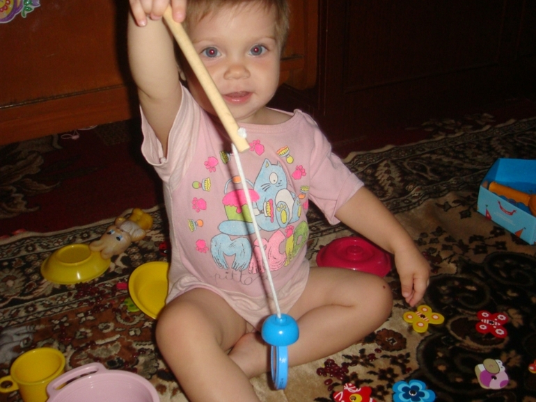 А в теремке жила лисичка. Надо наловить рыбку. Ну ловить рыбку (бабочек) Лизе нравится. Наловили накормили.