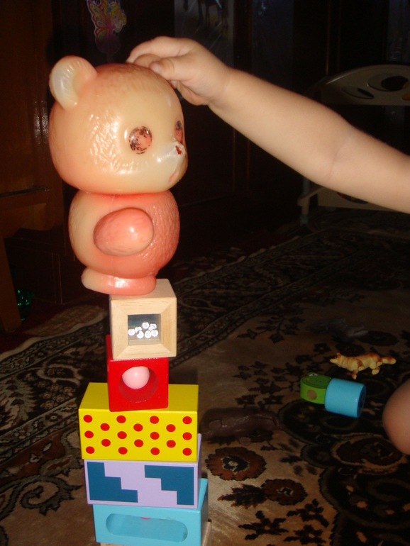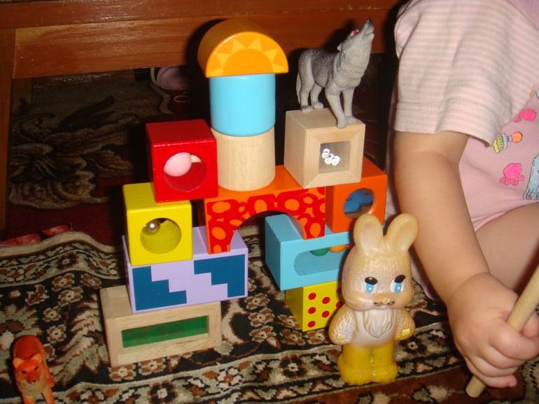 А потом видимо это все надоело теремок был разрушен, игрушки унесены с глаз долой. Ладно пошли перекусили и начали новый теремок строить. Вот такой