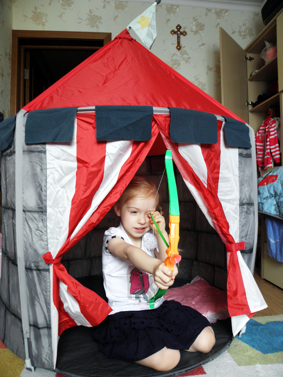 По случаю новой ТН Соню по утру ожидал сюрприз - рыцарский шатер (из Икеи) и лук со стрелами. Стреляла очень много))) во все подходящие мишени, вдохновленная мультфильмом «Храбрая сердцем»: