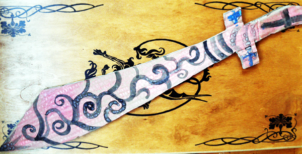 Наш волшебный меч! Папа вырезал из картонки (упаковка от какой-то техники), я показала как рисовать узоры черной краской, Соня продолжила: