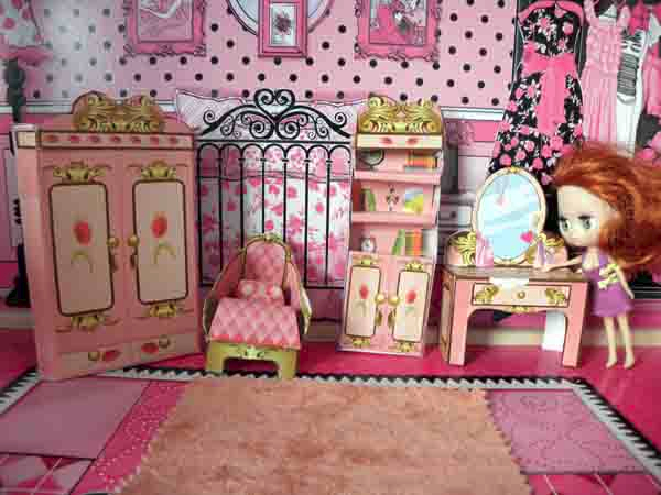 Купила совсем недорогую книжечку «Комната принцессы, сделай сам», вырезали детали, приклеивали на картонку, затем собирали, вот что вышло в итоге (шкаф, кресло, комод, туалетный столик):