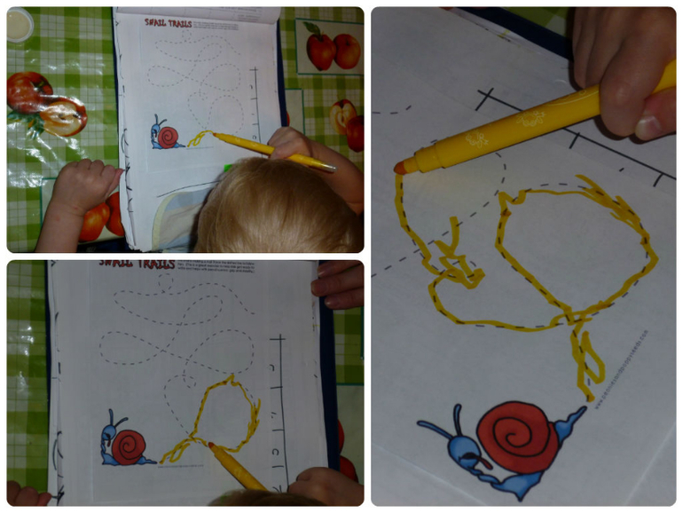 Слизняки всяческие оставляют след за собой - вот и нарисуй дорожку, которую оставляет улитка. Хорошо нарисовал.