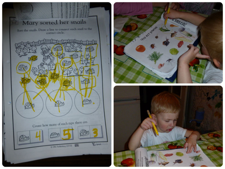 Сортировали улиток по узору на раковинах. Димке понравилось обводить в кружочек - считала я. Что ест улитка было похоже больше на что ест Дима. Он упорно пытался накормить ее колбасой и мороженным. И никакие рассказы, что у улитки язык как терка и ест она траву не помогали.