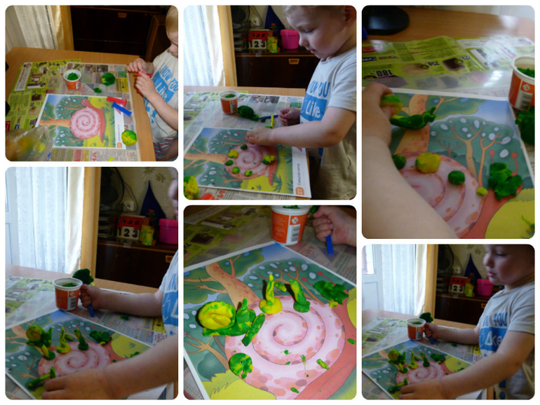 Творческий момент был связан с пластилином. Сначала украсили улитку шариками. Но так было скучно и Дима сказал сделать еще улитку. Слепила. И Димон все ее кормил, сажал травку, водил в гости ну и просто игрался.