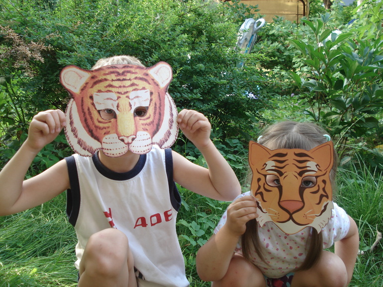 1. Для начала я распечатала детям маски тигров, они были очень довольны и пытались рычать! (Звук "Р" они у меня к сожалению не выговаривают).