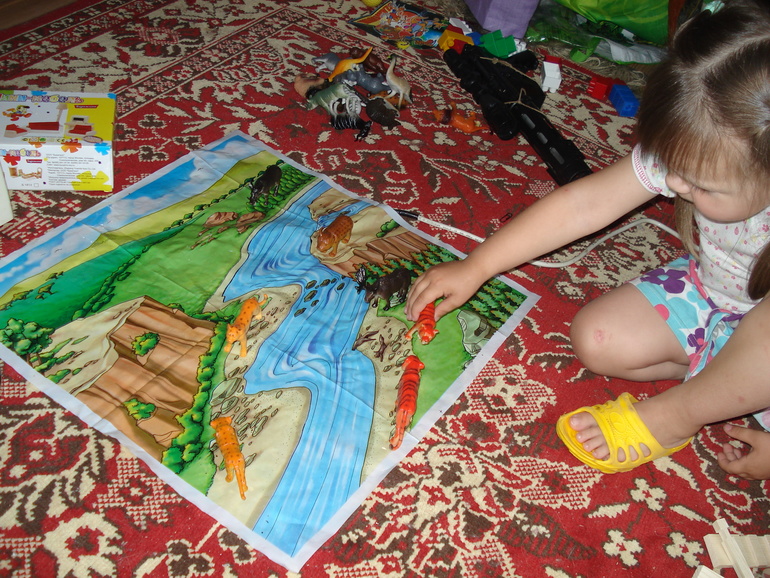 5. Выдала детям наборы животных с тиграми, леопардами и т.п. Один набор оказался с картой и они пытались размещать животных так сказать "на местности".