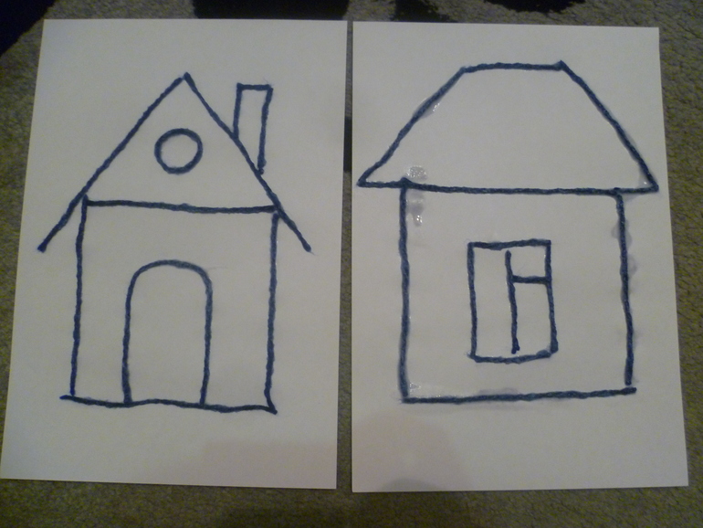 6. Немного творчества! Кусочки шерстяной нитки обмакнула в клей ПВА, составила композицию, а на следующий день раскрасили получившиеся дома: