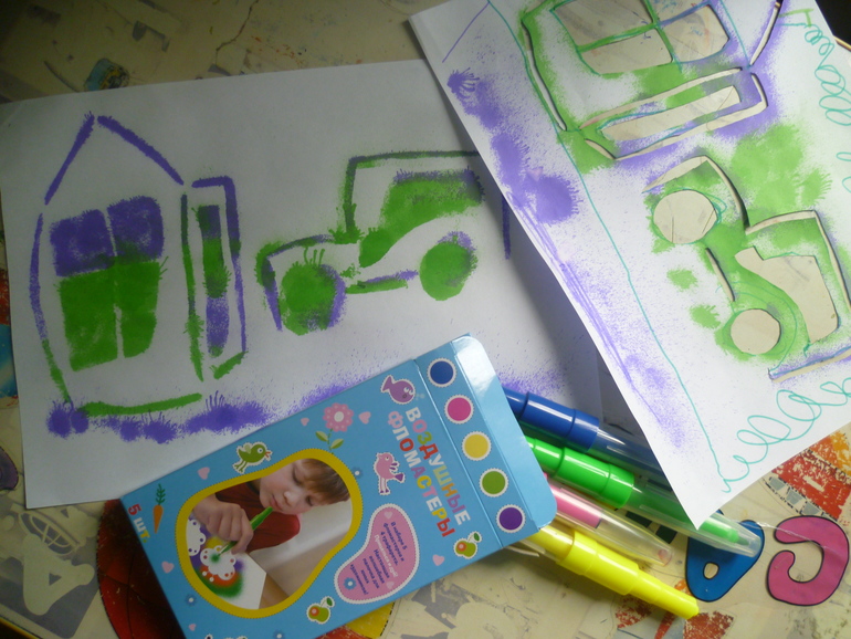 7. Еще творчество! Сашик рисовал,из его рисунка я вырезала трафарет, а вот это уже результат (использовали воздушные фломастеры):
