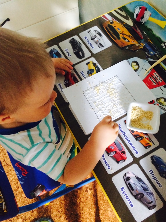 И еще одна коробочка - в фасоли находил предметы и называл :