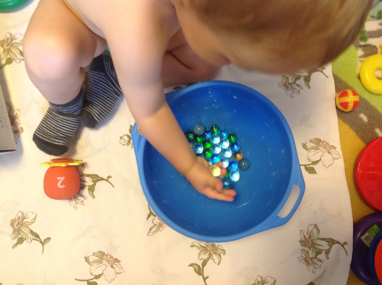 Примерно с годика я даю Мите шарики из Фикс Прайса в миске и он будет играться с ними, перекладывая с миски на пол и обратно, раскидывая все по комнате...