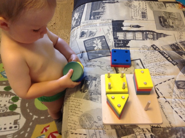 Играли с геометрическим сортером, повторили цвета, считали углы)) у круга Митя насчитал семь)))