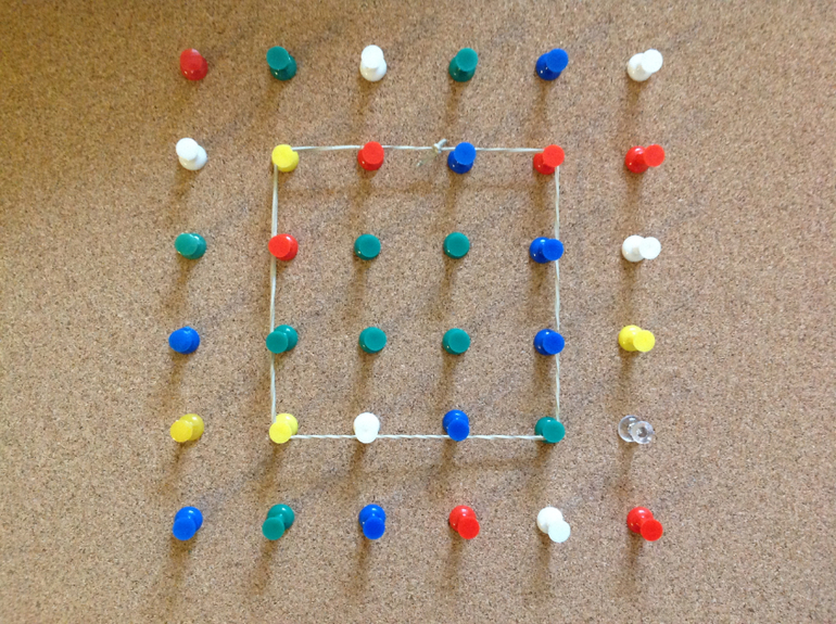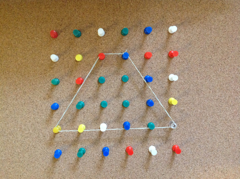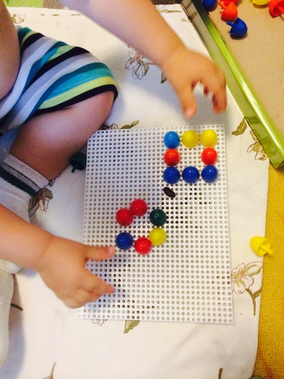 Сделала Митюшке геометрический планшет из пробковой доски (май-шоп), я делала фигуры резинкой для денег, получилось достаточно много фигур, а Митя их называл и пытался сделать их сам